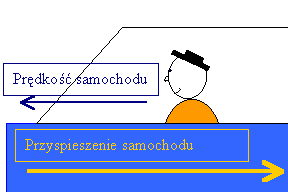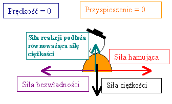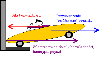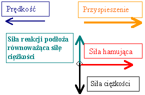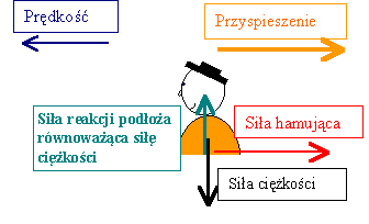 Opis sił działających na kierowcę w układzie inercjalnym.W układzie inercjalnym widzimy sytuację z zewnątrz (np. jako obserwator patrzący na samochód z chodnika). Widzimy, że samochód ma malejącą prędkość i przyspieszenie skierowane przeciwnie do tej prędkości. |