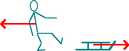 Pęd niesiony przez sanki (w prawo) jest równy co do wartości pędowi odbieranemu przez człowieka (w lewo). Opisany przykład ilustruje tzw. zasadę odrzutu. Chciałbym tu jeszcze raz zwrócić uwagę na to, że powiedziane było o kierunku (choć właściwie precyzyjniej byłoby mówić o "zwrocie") pędu. Bo: pęd, jako wielkość wektorowa, ma zwrot, kierunek i wartość. Wynika stąd też, że zasadę zachowania pędu powinniśmy raczej zapisać wzorem ze strzałkami nad wektorami pędu i siły: |