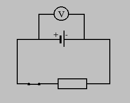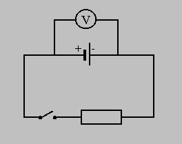 Przyjrzyjmy się najprostszemu obwodowi z prądem, tym razem uzupełnionego o woltomierz mierzący napięcie jakie wytwarza źródło prądu i wyłącznik, który pozwoli nam na porównanie sytuacji przed i po zamknięciu obwodu.