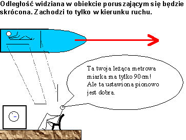Skrócenie długości.Podobnym zjawiskiem do wydłużenia czasu jest skrócenie długości. Istotą zjawiska jest stwierdzenie, że odległość mierzona z poziomu układu poruszającego się (względem układu, w którym "miarka" spoczywa) będzie inna, niż mierzona w spoczynku. Np. pręt o długości 1 metra obserwowany wtedy gdy koło nas przelatuje, jest dla nas krótszy, niż gdyby leżał sobie spokojnie obok. Efekt ten zachodzi jednak tylko w kierunku ruchu – gdyby miarka metrowa z naszego przykładu była ustawiona prostopadle do prędkości, to zarówno w układzie w którym spoczywa, jak i w tym w którym się porusza – cały czas będzie miała dokładnie 1 metr. Wynika z tego np. że przelatująca kula zamienia się dla obserwatora widzącego ją w ruchu w elipsoidę. Wyjaśnienie zjawiska skrócenia długości można znaleźć tutaj. W szczególnej teorii względności za długość obiektu w ruchu uznaje się różnicę odległości pomiędzy punktem końcowym i początkowym wyznaczane w tym samym czasie. Jest to bardzo ważne, że odnosi się to do tej samej chwili czasu w danym układzie odniesienia. bo jak się okazuje w innym układzie te same zdarzenia mogą wystąpić w zupełnie innej konfiguracji czasu (i oczywiście przestrzeni). Wyznaczenie położeń końca i początku pręta o jakiejś długości związane jest w rozważaniach Lorentza z wyznaczaniem czasu przelotu promieni świetlnych, które np. odbijają się od lusterek umieszczonych na końcach pręta. Znając te czasy łatwo jest wyznaczyć położenia punktów w momencie odbicia promieni. Czy skrócenie długości zaobserwowano doświadczalnie?Przeprowadzenie doświadczenia potwierdzającego fakt skrócenia długości w układach poruszających się jest niezwykle trudne. Mierzenie długości obiektów w ruchu musi odbywać się w oparciu o precyzyjne pomiary odbitych sygnałów świetlnych, a więc i tak nie stanowiłoby prostego, bezpośredniego potwierdzenia. Jak do tej pory nie są znane fizycznie zrealizowane doświadczenia potwierdzające lorentzowskie skrócenie długości. Zjawisko to jest jednak na tyle silnie związane z innymi efektami teorii względności (a w większości przypadków są one bardzo dobrze potwierdzone doświadczalnie), że świat nauki raczej nie poddaje faktu skrócenia długości w wątpliwość. |