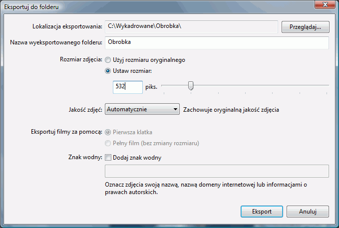 Teraz zwalniamy przycisk myszy i klikamy "Zastosuj". Efektem będzie skadrowana odpowiednio twarz do legitymacji. Teraz trzeba tę skadrowaną fotkę wyeksportować do wybranego folderu, dzięki czemu pojawi się jej kopia o żądanych rozmiarach. W tym celu należy wybrać kombinację ctrl shift S (ew. wybrać tę opcję z menu Plik). Do formatki musimy wpisać parametry właściwe dla naszego zdjęcia.