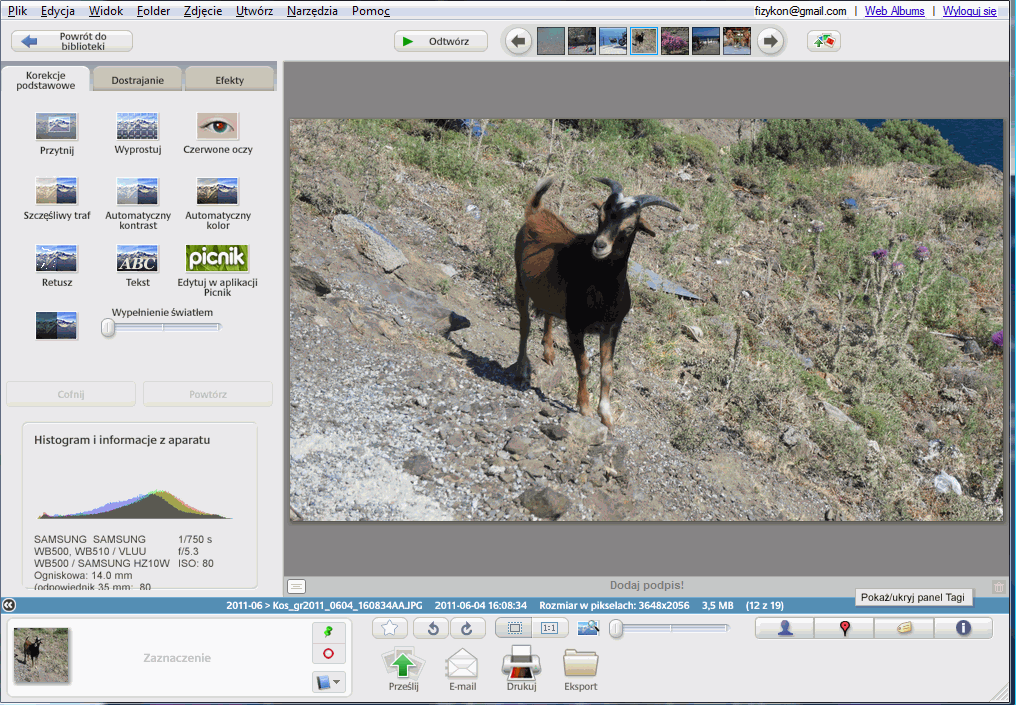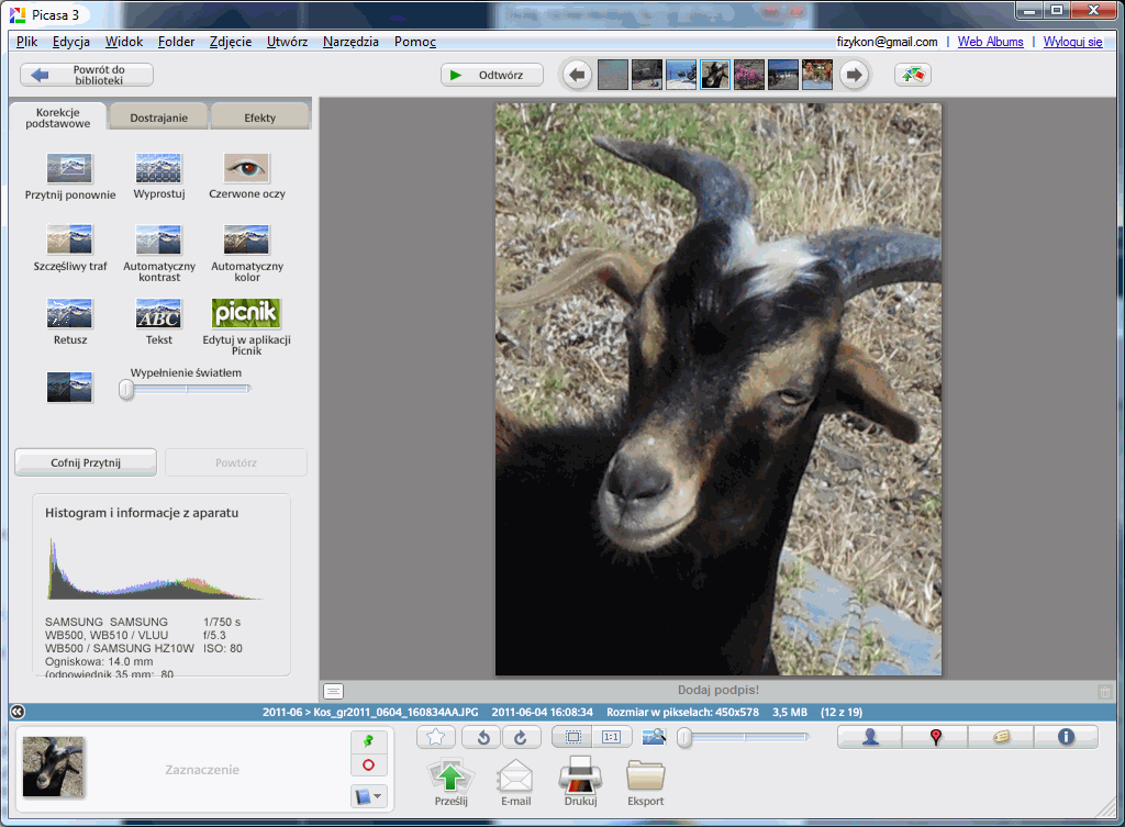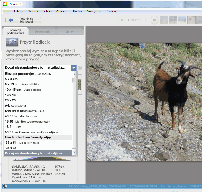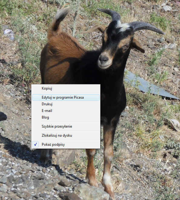 Na szczęście praktycznie wszystkie współczesne aparaty cyfrowe robią fotografie z na tyle dużą rozdzielczością, że nie musimy bardzo się starać o właściwe wykadrowanie podczas fotografowania. Ważne jest tylko, aby fotografia ogólnie obejmowała twarz danej osoby. Odpowiednie ujęcie można sobie później wyciąć w programie graficznym. Aby samo zdjęcie wyszło dobrze, warto jest na wzór wziąć sobie jakieś gotowe zdjęcie z legitymacji i w podobny sposób pokierować spojrzeniem fotografowanej osoby. Trzeba też przetestować kilka ujęć, bo na początku zapewne nie będziemy zadowoleni z uczesania, miny, czy ustawienia twarzy. Więcej porad na temat robienia zdjęcia można znaleźć w serwisie Phtoid.eu . Warto popróbować, zanim się wykona ostateczną odbitkęZapewne pierwsze próby zrobienia fotki do legitymacji nie wyjdą zapewne nam rewelacyjnie. Bo wcale nie jest to łatwe zadanie Ale nie trzeba się zrażać. Ćwiczenie czyni mistrza, więc próbując i poprawiając błędy, w końcu uda nam się zrobić jako tako dobrą fotografię twarzy. Ja byłem zadowolony dopiero mniej więcej z 20-ego zrobionego zdjęcia (na szczęście nie musimy płacić za miejsce na karcie pamięci... ;) ) W części poświęconej obróbce fotografii, do niniejszego opracowania, postanowiłem zrobić "legitymację" nie człowiekowi, ale zwierzakowi. Do tego celu użyję zrobionego kiedyś zdjęcia. Co prawda nie ma ono właściwego tła, ale za to jest pod ręką... ;) Opis kadrowania za pomocą programu Picasa 3Warunkiem podstawowym użyteczności tego opisu jest zainstalowanie na komputerze programu Picasa. Ja używałem wersji 3.8.0. Za pomocą tego programu zrobimy najważniejszą część roboty. Ale nie wszystko. 1. Zapisujemy zdjęcie w wybranym folderzePo zrobieniu fotografii aparatem cyfrowym plik ze zdjęciem przenosimy do komputera. Warto zrobić sobie jego zapasową kopię, bo podczas prób może nam się coś popsuć. Jak wspomniałem wcześniej, do przykładu użyję nie zdjęcia ludzkiej twarzy, ale zwierzęcego pyska. W tym przypadku kozła, którego miałem okazję "pstryknąć" podczas mojej wyprawy na grecką wyspę Kos. Nie używam zdjęcia istniejącej osoby, aby w tym przykładzie nie naruszać dóbr osobistych (mam nadzieję, że kozioł nie przyjdzie z roszczeniami). Teraz naszą fotkę trzeba będzie obrobić. W tym celu klikamy zdjęcie. Jeśli domyślnym programem jest Picasa 3, to zdjęcie powinno nam się otworzyć bez problemu. Teraz trzeba je odpowiednio wyedytować. Jeśli jest tylko w trybie poglądu, to po kliknięciu na fotce prawym klawiszem myszy powinna pojawić się opcja "Edytuj w programie Picasa"
