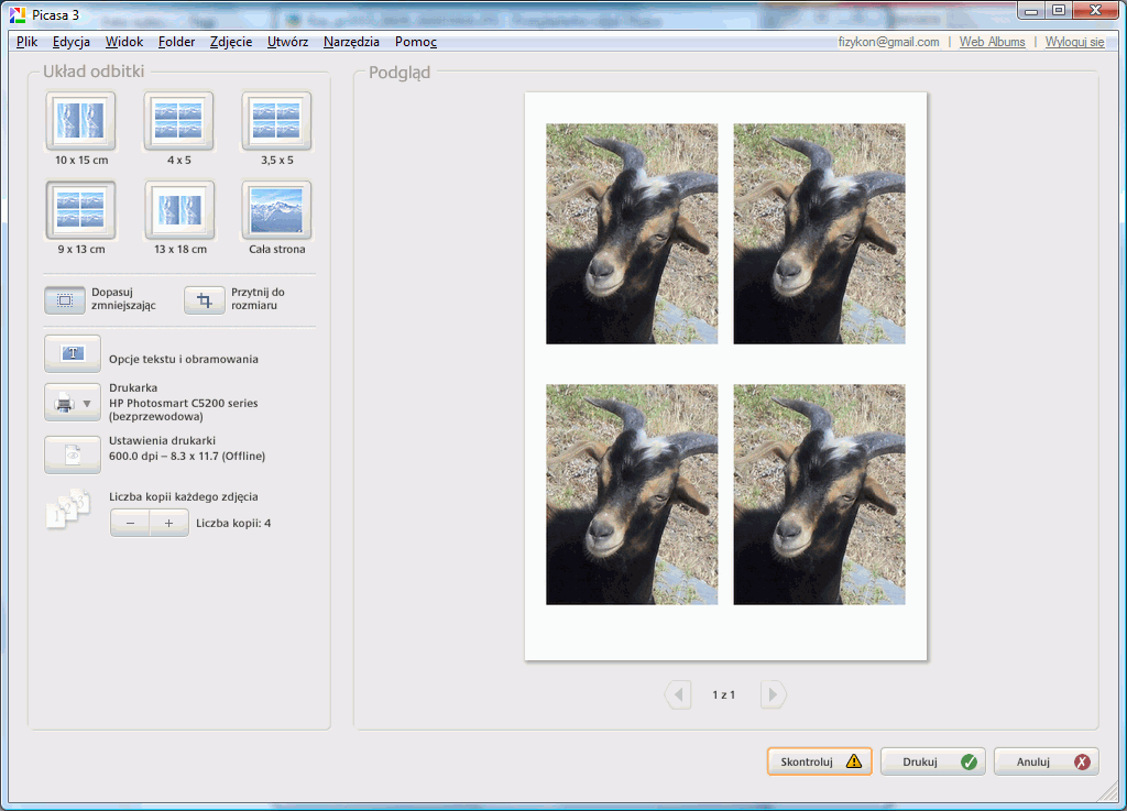 Załatwmy problem rozmiaru wydruku jednocześnie z powieleniem fotek na jednej odbitceProponuję rozwiązanie problemu wydruku za pomocą dodatkowego oprogramowania. Oprócz załatwienia problemu z wydrukiem w odpowiednim rozmiarze, warto jest dodatkowo zoptymalizować sobie te wydruki. Bo na pocztówkowym rozmiarze 10 x 15 cm da się zmieścić nawet 8 fotek 35 x 45 mm. Dobrze byłoby mieć na tym wydruku właśnie taką maksymalną ilość zdjęć legitymacyjnych. Niestety, aktualna wersja programu Picasa nie daje możliwości wygodnego tworzenia szablonu do wydruku kilku małych obrazków na odbitce. Aby uzyskać właściwy efekt posłużyłem się więc dwoma dodatkowymi programami: