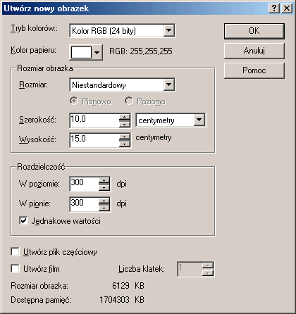 Nie udało się idealnie dopasować milimetrów, ale błąd poniżej 1 mm nie będzie dyskwalifikował naszej pracy. Operację zatwierdzamy klikając Ok. 3. Tworzymy szablon do wklejenia 4 kopii zdjęćAby zaoszczędzić pieniądze nasze zdjęcie do legitymacji wywołamy w 4 kopiach na jednej odbitce. Rozdzielczość ustalimy na standard 300 dpi. Taka rozdzielczość to standard w obróbce fotografii i większość (dobrych) fotolabów (czyli urządzań robiących odbitki) właśnie w tej rozdzielczości wykona nam odbitkę. Ponieważ będziemy robili odbitki 10 cm x 15 cm, więc taki rozmiar ustawimy dla naszego szablonu. W tym celu w Corelu Photo Paincie utworzymy nowy dokument o parametrach jak to widać na rysunku poniżej.