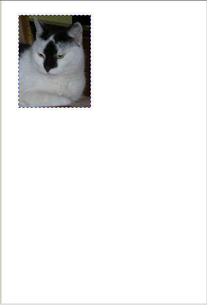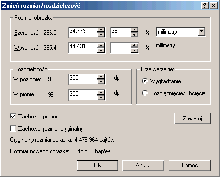 Teraz trzeba nasze okienko zaznaczenia rozciągnąć myszą - ciągnąć za dowolny z rogów - kwadracików zaznaczenia (jednak nie za boczne kwadraciki - wskaźniki!), tak aby zawarło ono portretowaną twarz. Dzięki temu rozmiar kadrowania nam się zwiększy a proporcje pozostaną takie jako ustalone poprzednio. Tak samo myszą okienko to można przesuwać, aby dobrze objęło docelowy obiekt. Po dopasowaniu okienka do twarzy, operację przycinania zatwierdzamy klikając dwukrotnie w oknie zaznaczenia. W ten sposób otrzymamy gotową fotografię do legitymacji. Naszej fotografii trzeba teraz nadać odpowiednie wymiary, czyli 35 x 45 mm w rozdzielczości 300 dpi. W tym celu wybieramy z menu: Obrazek -> Zmień rozmiar/rozdzielczość