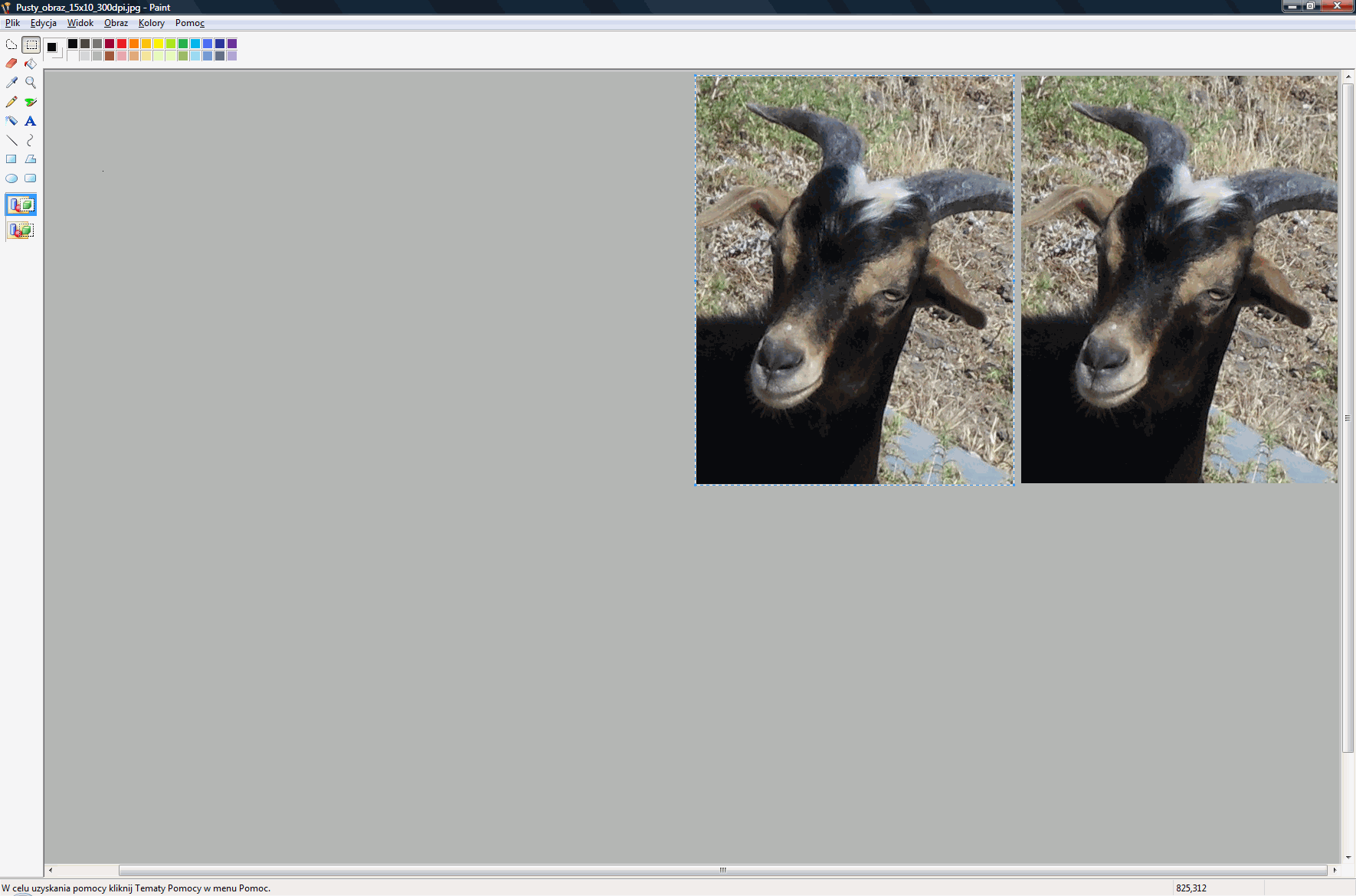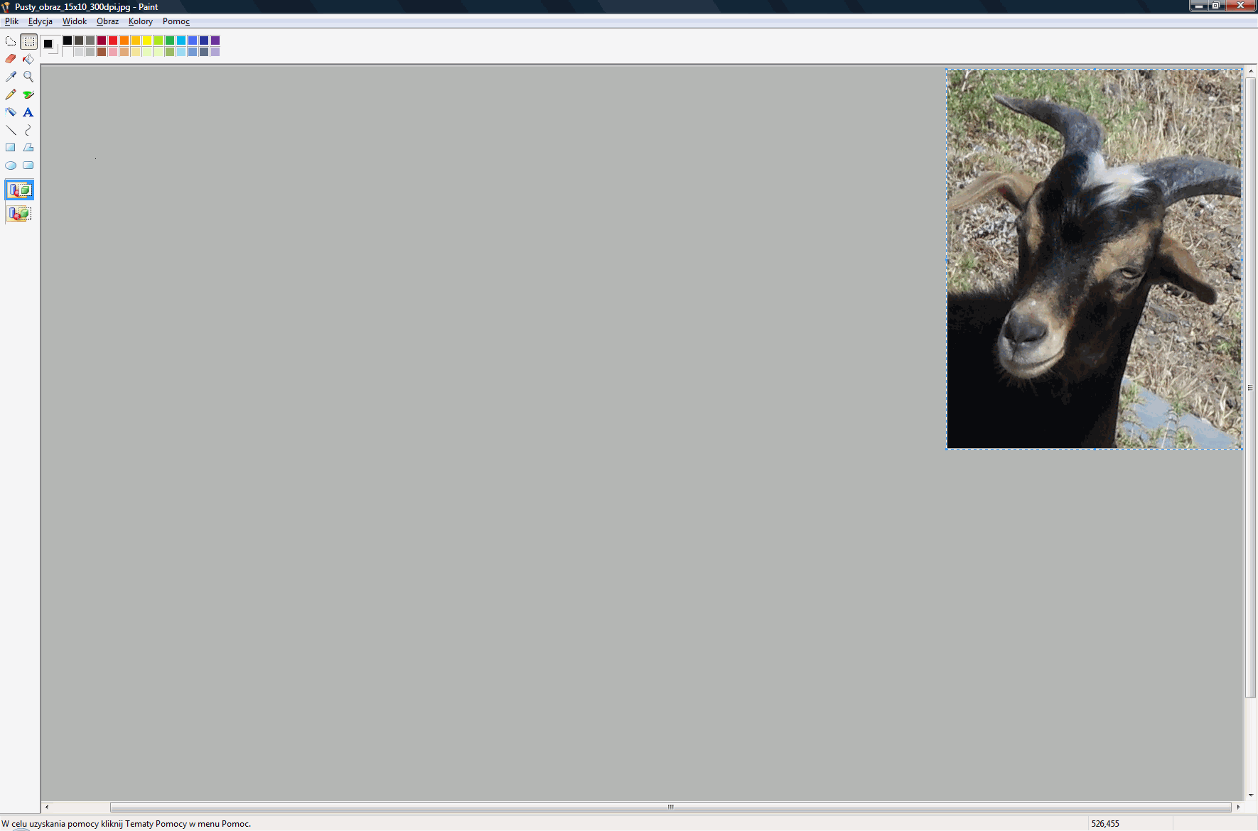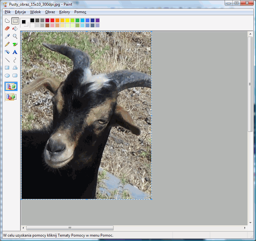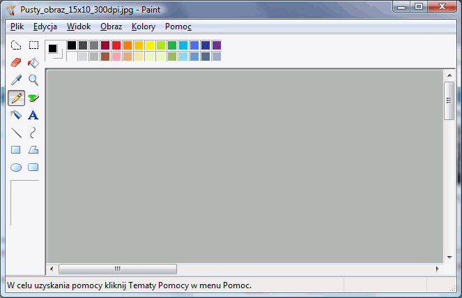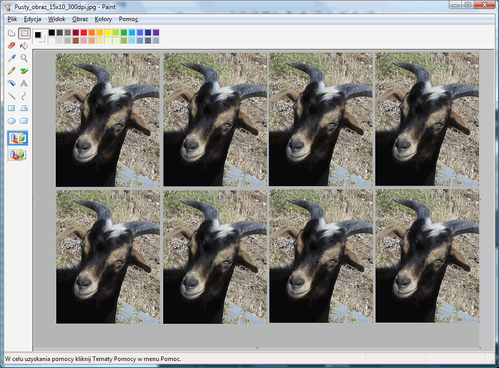 Wypełniamy szablon naszymi fotkami do legitymacjiGdy juz mamy gotowy nasz szablon, to najwyższy czas jest go użyć - czyli wypełnić kopiami zdjęcia legitymacyjnego. W tym celu posłużymy się standardowym windowsowym programem Paint. Niestety, ani IrfanView, ani Picasa nie nadadzą nam się do edycji poszczególnych fragmentów obrazków, a to jest wymagane w tym przypadku. Można też użyć innych programów - np. Gimpa (sprawdzałem), Photoshopa, czy Paint Shop Pro (te ostatnie dwa programy umożliwiają wykonanie wszystkich opisywanych czynności od początku tylko w nich). Otwieramy więc nasz szablon w windowsowym edytorze grafiki Paint.