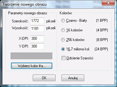 Wtedy irfanView wyświetli nam menu z opcjami nowego obrazu. Należy teraz ustawić wartości jak wskazano niżej: