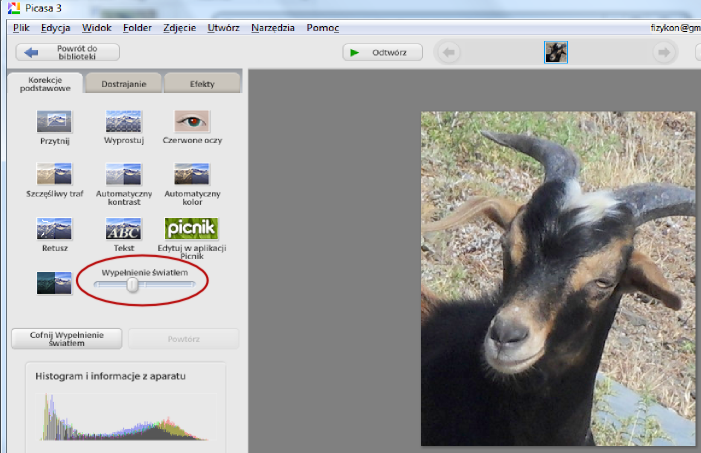 Retusze, czy inne dostosowaniaTaką fotkę możemy jeszcze obrobić dodatkowo - np. dokonać jakichś retuszy, zmienić tło, czy jeszcze coś innego. Później będzie wydrukować ją na domowej drukarce, bądź oddać do foto labu. Dobrze jest rozjaśnić obrazZ mojego doświadczenia wynika, że dobrze jest w większości przypadków dokonać rozjaśnienia fotografii do wydruku. Przy standardowych ustawieniach wydruki wychodzą zbyt ciemne. W tym celu należałoby otworzyć naszą obrobioną fotkę w Picasie i wśród opcji podstawowych wybrać "Wypełnienie światłem". Suwak tego narzędzia przesuwamy w prawo, aby otrzymać wyraźniej jaśniejszą fotografię.