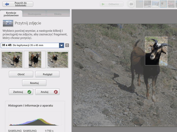 Tym narzędziem chcemy stworzyć okienko wycinania o właściwych proporcjach, czyli odpowiadających 35 mm x 45 mm. Po kliknięciu "Przytnij" otrzymamy następujący widok.