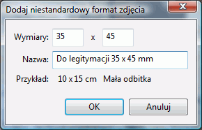 Wybierzemy tu opcję "Dodaj niestandardowy format zdjęcia". Wtedy program wyświetli nam następujące okno, w które wpiszemy wartości pokazane niżej. Musimy do formatki podać stosowne wartości.