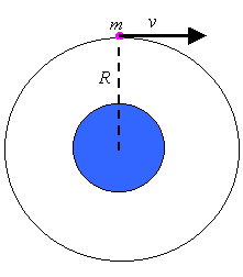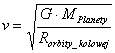 Skorzystamy także ze wzoru na siłę dośrodkową – patrz Siła dośrodkowa, tablice wzorów (v - prędkość), więc, po podstawieniu obu wartości sił do równania Fgraw = Fdośr, otrzymamy A stąd po pomnożeniu obu stron przez R/m, po obu stronach skróci się R i m, i dostaniemy: Teraz zamienimy strony równania i spierwiastkujemy je: Powyższy wzór pozwala na obliczenie prędkości jaka musi mieć ciało, aby orbitowało wokół planety dokładnie po orbicie kołowej o promieniu R. Zapiszemy go jeszcze raz dokładnie określając o jakie wielkości chodzi: I to jest właśnie nasz szukany wzór na prędkość ruchu satelity na orbicie kołowej. Wzór ten służy do obliczania tzw. pierwszej prędkości kosmicznej. |