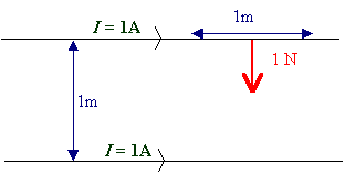 1 amper jest to natężenie takiego prądu stałego, który płynąc w dwu nieskończenie długich, nieskończenie cienkich przewodach prostoliniowych umieszczonych równolegle w próżni w odległości 1m od siebie wywołałby miedzy nimi siłę magnetyczną o wartości 2×10-7 N na każdy metr długości przewodnika.