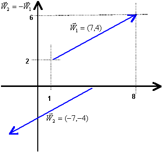Wektory przeciwneDwa wektory są przeciwne wtedy, gdy jeden z nich powstaje przez "odwrócenie" drugiego - tzn. koniec pierwszego wektora staje się początkiem drugiego, a początek pierwszego wektora końcem drugiego. Wektory przeciwne mają przeciwne współrzędne. Np. wektorem przeciwnym do wektora (7,4) jest wektor (-7,-4).
